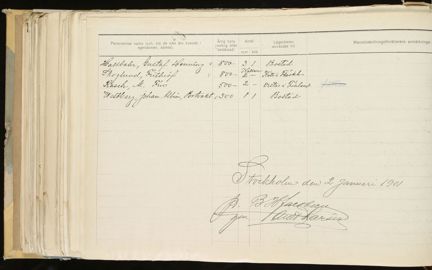 Blanketten är underskriven: ”Stockholm den 2 januari 1901. B H Jakobsén / gm And. Larsen.” Fastighetsägaren skulle alltid intyga att uppgifterna var riktiga. I det här fallet fanns han ju utomlands, därför fick hans ombud skriva under i hans namn.