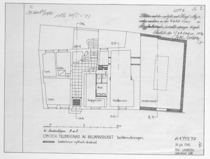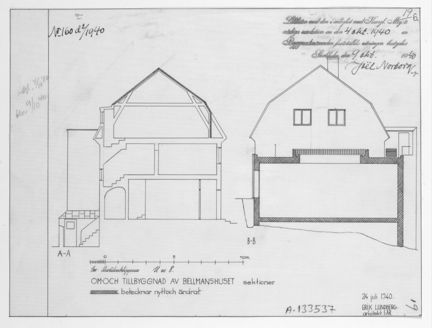 Underlag för bygglov år 1940, fastigheten Urvädersklippan mindre 8. Innehåller tomtkarta samt planritningar och fasadritningar. 3 bilder. Bellmanhuset visas den första söndagen i varje månad (i november den andra söndagen). Huset har en egen webbplats som du når via länken nedan. Ordenssällskapet Par Bricole, som äger huset, nås via den andra länken. Även den längst ner på den här sidan.