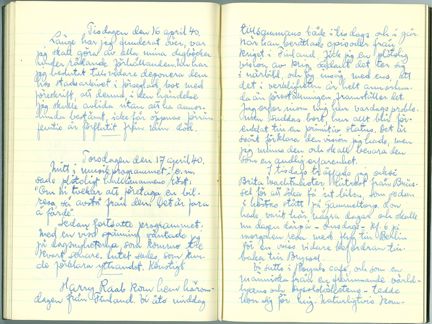 "Torsdagen den 17 april 1940. Mitt i musikprogrammet i e.m. sade plötsligt hallåmannens röst: Om ni tvekar att företaga en bilresa, så avstå från den. Det är fara å färde. Sedan fortsatte programmet. Med en viss spänning väntade jag på dagsnyheterna, som kommo tre kvart senare. Intet sades, som kunde förklara yttrandet. Konstigt."