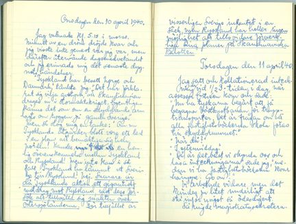 "Torsdagen den 11 april 1940. Jag satt och kollationerad[sic] inteckningar vid 1/2 3-tiden i dag, när assessor Estréen kom och sade: Nu ha tyskarna begärt att få begagna Västkustbanan för trupptransporter. Det är frågan om att alla fastighetsböcker skola föras till skyddsrummet. När då? I eftermiddag. Då är det bäst vi skynda oss och läsa inteckningarna, sade jag, medan vi ha fastighetsböckerna kvar häruppe. Go on! Vi arbetade vidare, men det kändes ju litet underligt att stå inför något så ödesdigert."