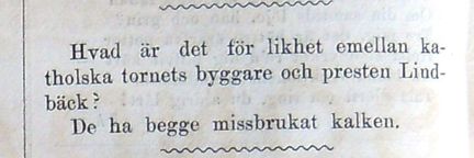 Den satiriska bilden föranleddes av följande: 1866 hade församlingen vid den katolska kyrkan Sankta Eugenia vid Norra Smedjegatan 24 påbörjat en utbyggnad av kyrkan. Bland annat var man i färd med att resa ett 40 meter högt torn. Den 23 maj slutade bygget med en katastrof. Tornet rasade och 24 människor avled i rasmassorna.