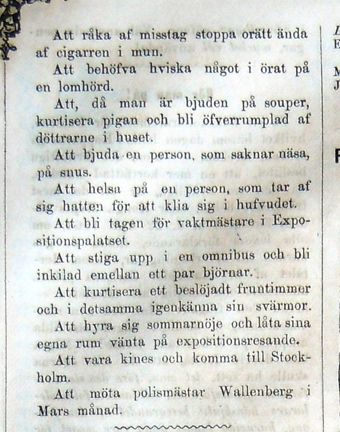 Skämtsam notis om vilka pinsamheter en manlig journalist kunde råka ut för under sommaren 1866. En del av skämten handlar om den pågående Stockholmsutställningen. Andra sidan kan du nå i bildvyn ovan.