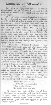 Det är hr Davidsson som visat denna pietet mot det vördnadsvärda minnesträdet. Bekant är, att man också har honom att tacka för det i allo smakfulla och väl arrangerade skick, hvari platsen i dess helhet befinner sig, onekligen den förämsta på Djurgården i afseende på natur och anläggning förenade. Man måste ovilkorligt med Fredman utropa: