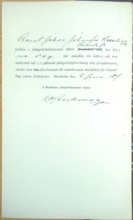 I protokollet finns ett brev från Fattigvårdsnämnden, daterat 2 juni 1887, som meddelar att Johansson Hessling inte kan komma ifråga för understöd och således ska som lösdrivare behandlas.