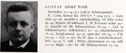 Wahl var ledamot av Stadsfullmäktige 1910-1924 och var invald av Arbetarepartiet (Socialdemokraterna). Yrkesmässigt var han bland annat telefonmontör och hade en rad politiska uppdrag. 1912 till 1920 satt han t.ex. i folkskoledirektionen.
