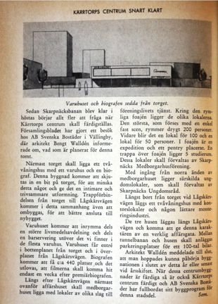 Text, tagen från marsnumret 1959 av Skarpnäcks församlingsblad, som berättar om Kärrtorps nya och strax helt färdigställda centrum.
