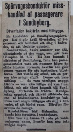 Text om hur en spårvagnskonduktör blivit misshandlad av två ”tämligen snyggt klädda” passagerare på spårvagnen vid Sundbyberg. Från Stockholms Tidningen den 9 september 1911.