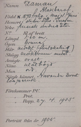 I april 1905 skickades den persiske undersåten Alakbarof Zaman, 32 år, till Stockholm från Helsingforspolisen. Läs mer om varför i polisrapporten! På baksidan av det här polisfotografiet finns följande information: