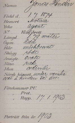 I januari 1903 anhölls Jonas Hendén, misstänkt för förfalskningsbrott. Polisen lät då fotografera honom.