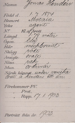I januari 1903 anhölls Jonas Hendén, misstänkt för förfalskningsbrott. Polisen lät då fotografera honom.