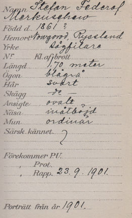 När Stephan Merkushew och tre av hans sågfilarkollegor kom till Stockholm den 22 september 1901 togs de in på förhör och fotograferades. Här kan du läsa polisrapporten som skrevs vid tillfället.