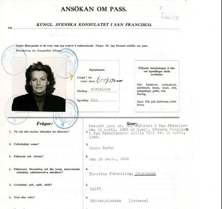 1940 fick Sverige ett centralt passregister, som till 1964 fördes av Statens kriminaltekniska anstalt och därefter av Rikspolisstyrelsen. Här ingår följaktligen även passansökningar från utlandssvenskar. Dokumentet som är beskuret är undertecknat av Hollywwoodstjärnan: