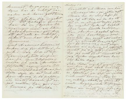 Carl Arosenius hälsar och tackar dig för ditt bref, han gick i dag kl: 10 ut till Hammarby tull derifrån han på den tillfrusna insjön på skridskor fortsatte vägen ända till Lennärtstadnäs (deras landställe som du vet) och återkom kring 1, då pappa åter mötte honom, det var god motion, han går 1 mil i timman på skridsko.