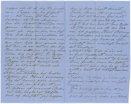Du spådde ganska riktigt då du påstod att det skulle bli tystare och mindre besökande än vanligt i hemmet. Du minns kanhända jag sa ”du skall få se att vi skola roa oss och ha så mycket främmande” men dertill ha vi ingen håg när det kommer dertill, jag tycker till och med att det är påkostande att gå ut och promenera. Pappa och jag tura dock om dermed, för Johns skull. John köpte ett album häromdagen för den [svårtydd valuta] du skänkte honom. deri äro August’s och mitt porträtt insatta, han ville så gerna ha ditt, men jag har blott ett qvar och det vill jag behålla sjelf. Jag skall laga att han får ett af pappa och ett af dig till julgåfva. Pappa har nu flyttat in i ditt rum. Det har den fördelen att hans skrifrum kan bli städadt straxt på morgonen. Anna har nu lemnadt oss, dagen före hon flyttade fick hon underrättelse att hennes mor var död, och emedan hon höll den gamla mycket kär, så var det en stor sorg. Hon bad entligen att jag skulle hälsa dig mycket. Vi hjelpa oss bra fastän Anna är borta. Pappa är nöjd dermed och Sofi är utmärkt snäll och alltid glad.