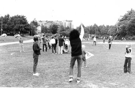 Fotografier från drakbyggarverkstäder i parklekarna i Hägersten sommaren 1982. Verkstäderna leddes av Johanna Hellsing och Amazonas.