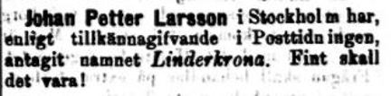 Texten till bild nr. 2 är tagen från Posttidningen, där man kommenterar namnbytet med "Fint ska det vara". I enlighet med 1901 års namnlag hade man rätt att ta sig adliga namn, men bara man inte stavade dem likadant!