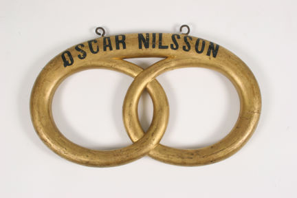 Två bageriskyltar av guldbronserat trä, formade som kringlor. Den ena kringlan är flätad, den andra slät. På bägge sidorna av kringlorna står det skrivet "Oscar Nilsson" med svarta bokstäver.