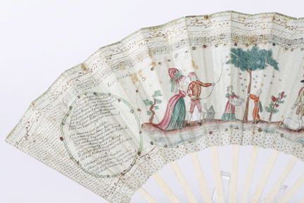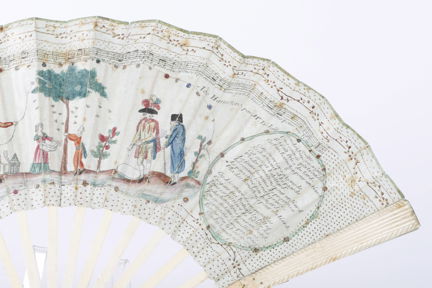 Solfjäder av elfenben och papper. På pappret en en målad scen av ett par, en pojke som ruskar ned blommor, en flicka som tar emot dem, samt två adelsmän. På vardera sidan därom en fransk sångtext i ovaler. Utefter kanten en notrad med fransk text till.