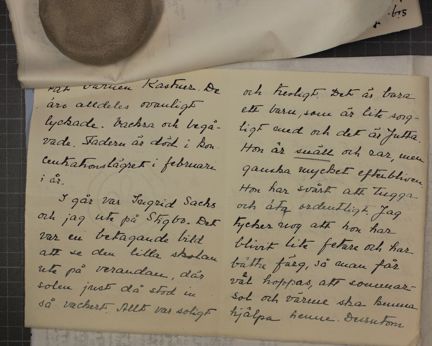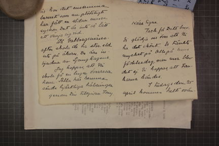 Igår var Ingrid Sachs och jag ute på Stigbo. Det var en betagande bild att se den lilla skolan ute på verandan, där solen just då stod in så vackert. Allt var soligt och trevligt. Det är bara ett barn, som är lite sorgligt med och det är Jutta. Hon är snäll och rar, men ganska mycket efterbliven. Hon har svårt att tugga och äta ordentligt. Jag tycker nog att hon har blivit lite fetare och har bättre färg, så man får väl hopppas, att sommarsol och värme ska kunna hjälpa henne. Dessutom är hon det ensamma barnet som plötsligt fått en sådan massa syskon. Det är inte så lätt att vänja sig vid. På Valborgsmässoafton skola de ha stor eld ute på åkern. De äro inbjudna av Ljunghagens. Jag hoppas att Ni skola få en lugn överresa hem. Alla här hemma sända hjärtliga hälsningar genom Din tillgivna Tony.
