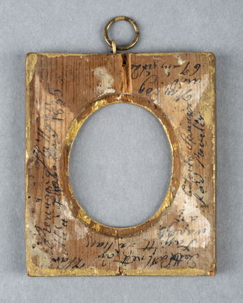 Minityrportätt målat i oljefärg på medaljong av elfenben. Porträttet mäter endast 8,5 gånger 7,5 cm. Till målningen hör en rektangulär ram i guldfärgat trä.