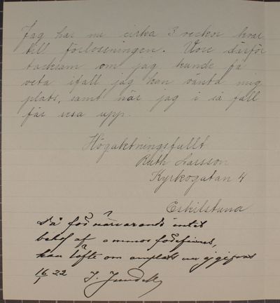 Ruth ber om ursäkt att hon besvärar och ber återigen om möjligheten att ta plats som amma. Längst ner i brevet finns en liten anteckning gjord av någon anställd vid Allmänna barnhuset. "Då förnärvarande intet behof af ammor förefinnes, kan löfte om amplats nu ej gifvas, 16/1 22."
