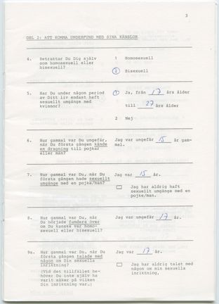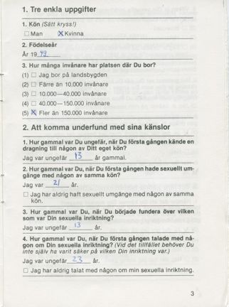 Den livssituation som homosexuella då befann sig i gjorde kontakt med de svarande svår, det var helt enkelt inte särskilt lätt att leva öppet. Bland de som svarande finner vi män och kvinnor, unga och gamla, hög- och lågutbildade. Syftet med undersökningarna var att få en uppfattning om hur homosexuella upplevde sin situation och omgivningens attityd till homosexualitet. De delar av undersökningen som riktade sig till homosexuella utfördes genom enkätundersökningar och anteckningar från telefonsamtal till RFSL:s telefonjour.