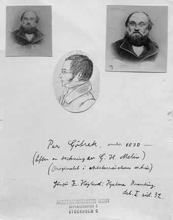 BILD 1: Per Götrek (1798-1876). BILD 2: Per Götrek och hans fosterdotter. BILD 3: Per Götrek cirka 1870. Efter teckning av G H Melin. BILD 4: Huset på Järntorget 85 i Gamla stan där polisen gjorde razzia 1848. Ref kod bilder: 3039/07088b, 07089, 07090 samt 3031/0957.
