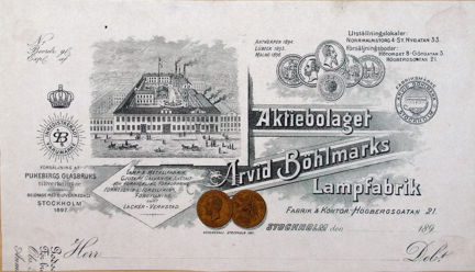 På faktura hvudet står: Arvid Böhlmark Stockholm. Lamp- och Metallfabrik, Galvanisk Anstalt. Utställningslokal: Norrmalmtorg N:o4. Försäljningsbodar: St. Nygatan N:o 36, Hötorget N:o 8, Götgatan N:o 3, Högbergsgatan N:o 21.