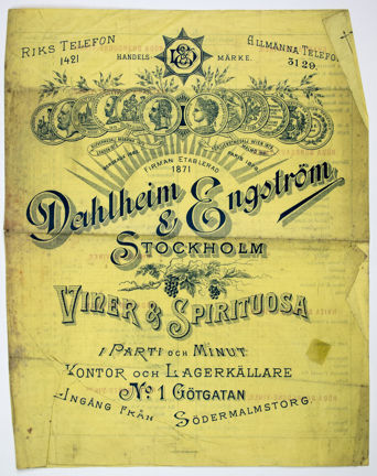 På prislistan står: Dalheim & Engström, Viner & Spirituosa. I Parti och Minut. Stockholm.