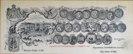 Fakturahuvud i svartvitt med medaljer och fabrik.