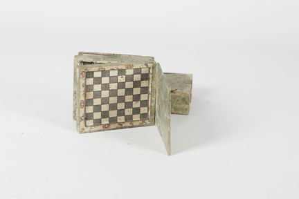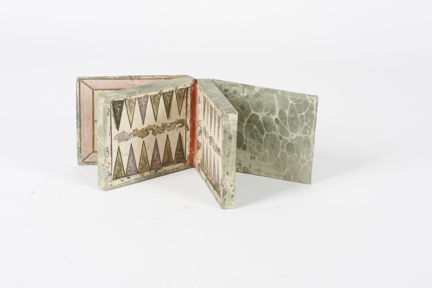 Resebrädspel med fodral från cirka 1750–1775. Stommen är tillverkad av trä och på utsidan klätt med marmorerat papper. Spelet har samma papper på en inre pärmsida.