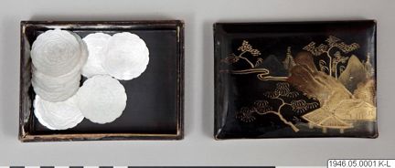 Den här kinesiska lackasken innehåller fem mindre askar med samma slags dekor. I var och en finns spelmarker i skimrande pärlemor. Alltsammans är tillverkat i södra Kina kring mitten på 1700-talet. Det kommer ifrån en verkstad som tillverkade saker för den europeiska marknaden, för sådana här marker används inte i kinesiska spel.