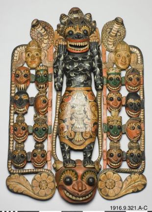 På fotografiet syns den sal i Riksmuseets etnografiska avdelning, där museet visade samlingar från Ceylon (Sri Lanka). Där är krukor och trummor. På väggarna hänger färgrika, singalesiska masker som använts i Kolam-dans. De föreställer bl a en kung, en drottning och en lång rad demoner. Rakt fram vid fönstet hänger Maha-kola sanni yaka, som är ledare för Sanni-demonerna.