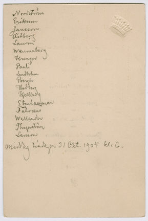 Här ser vi fram- och baksidorna av middagens tryckta menykort. Det var sju rätter som serverades den kvällen och maträtternas namn är angivna på franska. Finare middagar på den här tiden bestod alltid av fransk mat. På baksidan av menykortet står gästernas namn.
