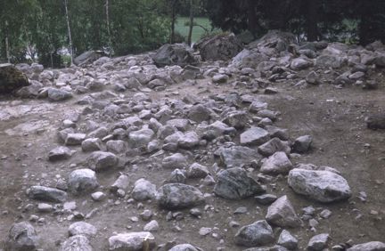 Stensättning, rund, ca 4 meter i diameter och 0,8 meter hög med tydlig kantkedja bestående av 0,2-0,3 meter stora stenar. Anläggningen var uppbyggd av 0,1-0,6 meter stora stenar lagda i 2-3 skikt med mylla mellan stenarna. Anläggningen var belägen på pinnmo och berg i de södra delarna.