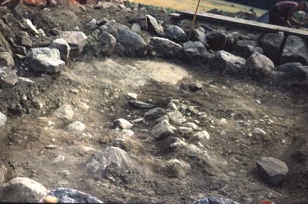I den SO delen av anläggningen påträffades ett 1 x 1,5 meter stort och 0,26 meter djupt sotlager, innehållande keramik, bränd lera, brända ben och kol. Ytterligare en ca 0,4 meter stor och 0,21 meter djup sotfläck påträffades i anläggningens centrum. Spritt i hela anläggningen fanns keramik. Omedelbart N om anläggningen påträffades ett järnfragment samt 2 m O därom en pärla.