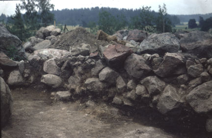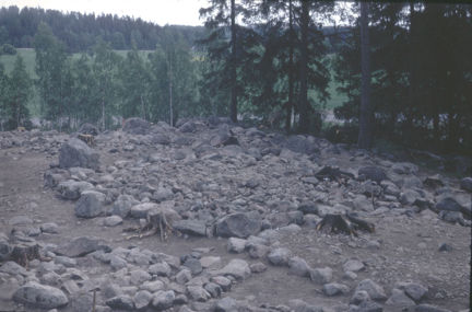 Stensättning, kvadratisk, 9,5 meter stor och 1 hög med tydligt lagd kantkedja bestående av 0,5-1 meter stora stenar. Anläggningen var uppbyggd av 0,1-0,7 meter stora stenar lagda i 3-4 skikt med fyllning av mylla. Botten utgjordes av pinnmo och berg.