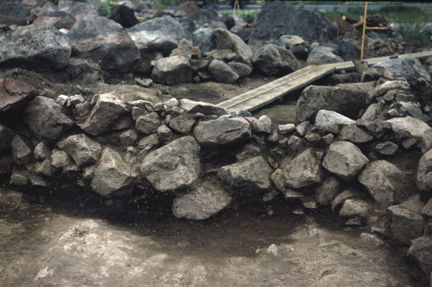 I den SV delen av anläggningen, i mörk mylla, påträffades en 0,4 meter stor och 0,14 meter djup koncentration av keramik, obränd lera, brända och obrända ben samt kol.