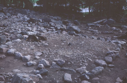Stensättning, rund, 9 meter i diameter och 0,6 meter hög, med tydligt lagd kantkedja bestående av 0,5-1 meter stora stenar. Anläggningen var uppbyggd av 0,2-0,8 meter stora stenar med fyllning av mylla. Botten utgjordes av pinnmo. I anläggningens centrum påträffades ett 2 x 3 meter stort och 0,26 meter tjockt brandlager med sot och kol, innehållande ett bronsfragment, keramik, bränd och obränd lera, brända ben och kol.