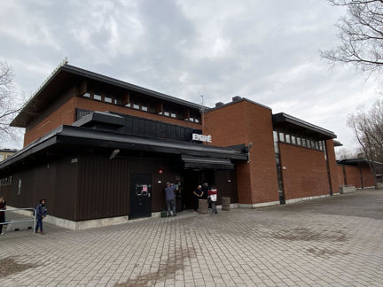 The school, swimming baths and public library date from the early 1980s and were designed by Gösta Uddén in a postmodern, oriental idiom that mixed brick, wood and concrete. Landscaping by Gunnar Martinsson and sculptures by Olof Hellström. (2023)