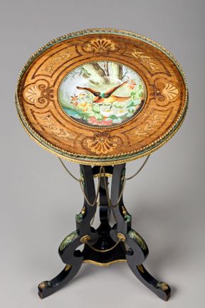 Bordet är mönstrat i olika träslag (kallat intarsia) med en porslinsskål i mitten. I skålen finns ett motiv av en fågel med en kvist i näbben, mot en bakgrund av blommor och träd.