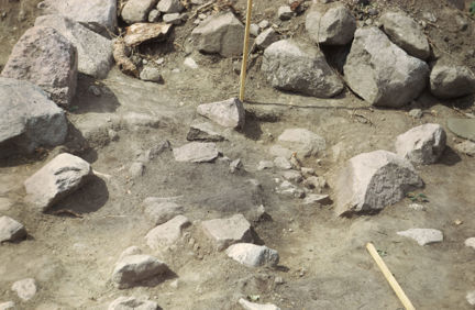 I anläggningens centrum påträffades ett 0,6 x 0,75 meter stort och 0,18 meter tjockt brandlager med sot och kol, innehållande järnfragment, keramik, bränd lera, brända ben, tänder och kol.