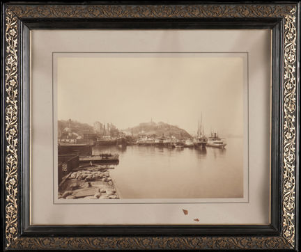 Det här fotografiet från 1890-talet visar Tegelviken med Södra varvet sett mot väster med Erstaberget i bakgrunden.