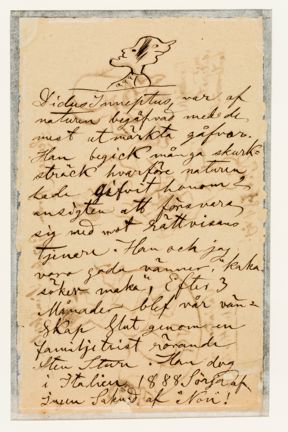 Lidus Inneptus var af naturen begåfvad med de mest utmärkta gåfvor. Han begick många skurksträck hvarföre naturen hade gifvit honom 2 ansigten att försvara sig mot rättvisans Tjenare. Han och jag voro goda vänner, "kaka söker maka". Efter 3 Månader blef vår vänskap slut genom en famlijetvist rörande Sten Sture. Han dog i Italien 1888. Sörjd af ingen. Saknad af "Non"!