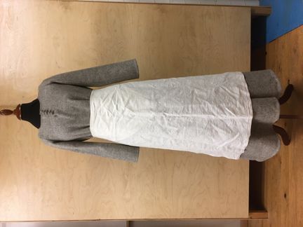Klänningen är sydd av ett grovt ylletyg som är ofärgat. Hantverkarnas kläder behövde vara tåliga och starka och skydda mot både väder och vind.