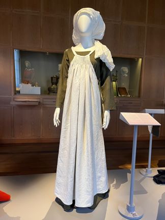Kvinnans förkläde är i grovt linnetyg. Det är gjort av två rektanglar som sys ihop längs sidorna nedifrån halvvägs upp på kroppen. Denna typ av förkläde är vanlig i avbildningar från 1400-talet av bibliska förlossningsscener. Barnmorskor eller jordemödrar kan ha burit denna typ av förkläden.