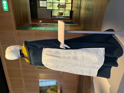 Dräkten är sydd 2024 av Medeltidsmuseets sömmerska Åsa Dahlstedt. Den finns utställd på Historiska museet i utställningen Medeltida mode Medeltidsmuseet c/o Historiska museet.