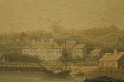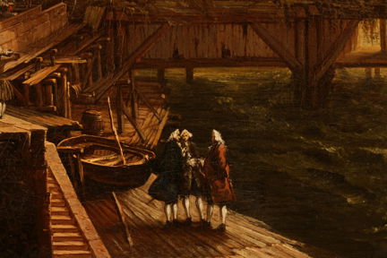 Bildspelet zoomar in detaljer i målningen. Första bilden visar tre eleganta herrar i tidstypisk klädsel som står på den provisoriska träkajen vid Stallkanalen. En roddbåt har dragits upp på kajen för att skydda den mot de virvlande strömmarna i kanalen. I andra detaljbilden zoomar vi in bebyggelsen på Kungsholmen och en bit av Nya Kungsholmsbron. I tredje bilden ser vi en byggnad som sticker upp ur Riddarfjärden. Det är Strömsborg, ett badhus med dusch som bara kunde nås med båt.