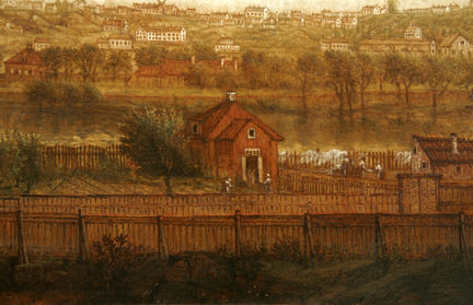Tvärsöver Blekholmen löper Gamla Kungsholmsbrogatan. Den gick mellan Kungsholmen och Norrmalm via Blekholmen. Byggnaden längst till höger i utsikten är Serafimerlasarettet. Det var tidigare en malmgård men byggdes successivt om och byggdes ut under 1700-talets andra hälft. Balkom malmgården ligger Skinnarviksbergen. De vita husen längst till höger är Riddarholmen.