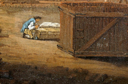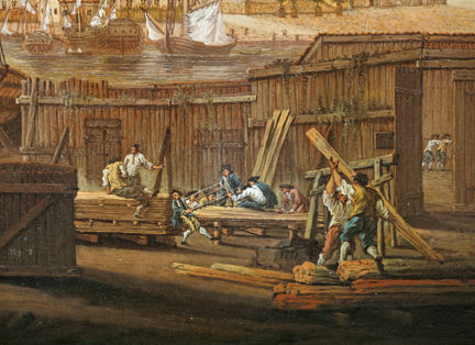 Materialgårdar och förråd är inhägnade med höga plank, och i centrum står en parm; andra är placerade på munkbrokajens hörn mot Riddarholmskanalen. Ett stort arbetslag håller på att kapa och strölägga plank och bräder. Vid stapelns ände plitar skrivaren på knä med penseln i högsta hugg, kanske på en skylt.